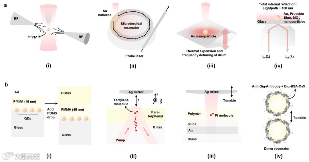 对照型的显微镜单颗粒光谱技术方法的建立(图1),包括被动型方式(联用原子力显微镜、透射/扫描电镜)和主动型方式(原子力针尖操控、光镊等),为这些研究内容提供了方便。