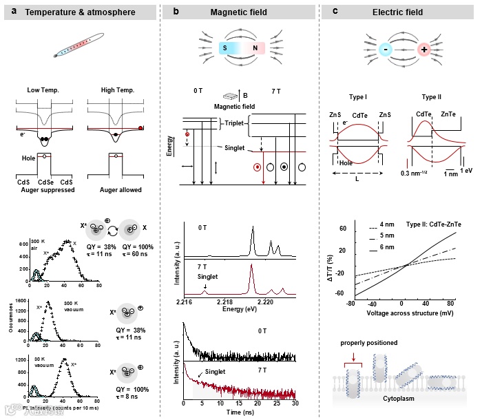 纳米材料在不同光学维度的荧光特性除了决定于本征的电子跃迁特性之外,激子或电子也可以对外部场的刺激做出反应,例如温度、磁场和电场(图2)。