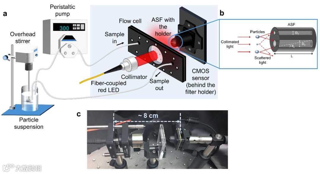 关键的创新是小角度空间滤波器(ASF),它由一组不同直径的孔组成,这些孔是从聚合物棒中挤出来的。在照亮目标样品时,光散射并通过ASF到达传感器。从不同大小的孔中收集的光代表了不同的散射角度。采用自适应机器学习(ML)模型将传感器图像转化为粒子大小。