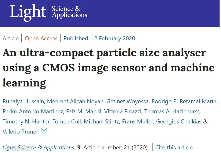 近日,西班牙光子科学研究所(ICFO)Valerio Pruneri教授带领的研究团队与荷兰、丹麦、德国、英国等欧洲科学家和工程师团队合作在国际顶尖学术期刊《 Light: Science & Applications 》发表题为“ An ultra-compact particle size analyser using a CMOS image sensor and machine learning ”的高水平论文。