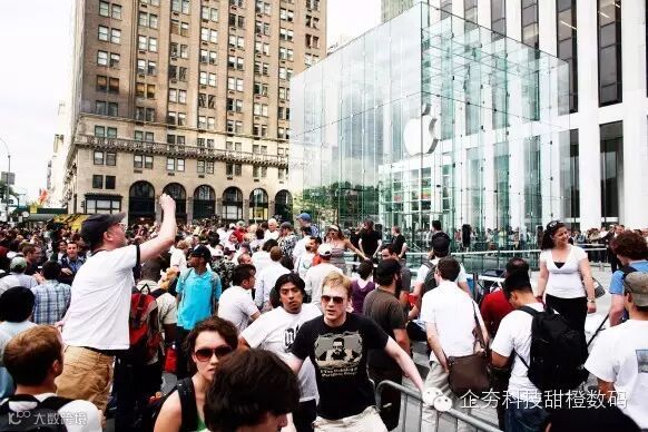 排队的人群蜿蜒了数个街区,那时队伍中苹果信徒与黄牛的比例正好和今天相反。人们已经等待了数日,表面上虽然无动于衷,却难掩内心的激动。甜品公司Krispy Kreme在现场派发甜甜圈。隔壁的施瓦茨玩具城则向队伍里的前100人放送礼品袋(现场的人实在太多,成百上千)。