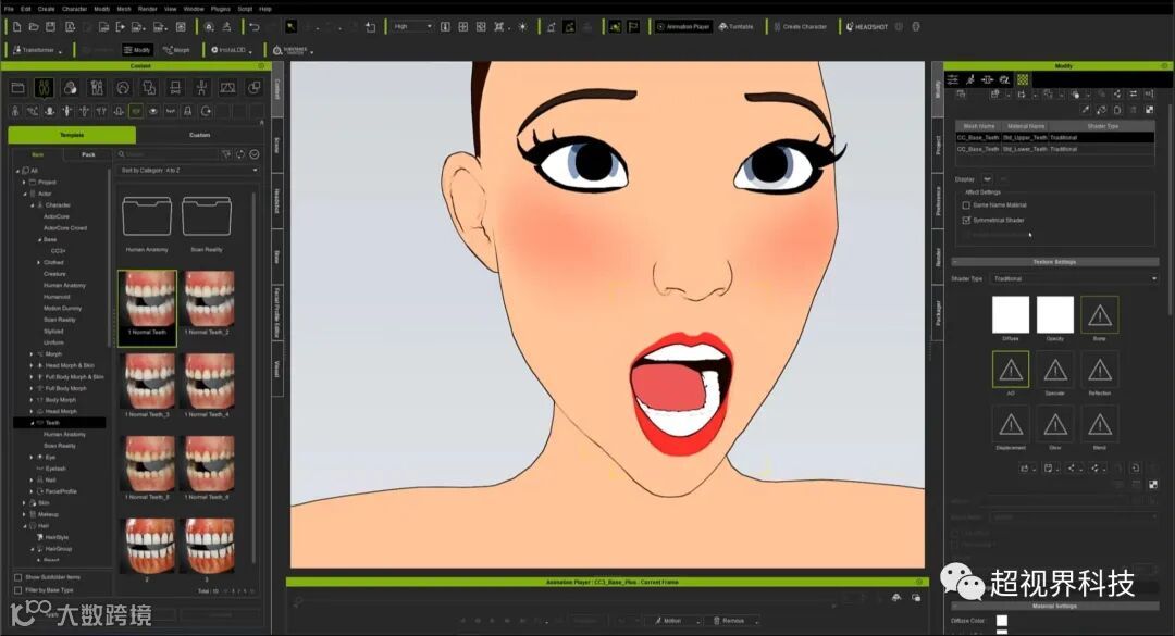 Character Creator 为这些实例提供了卡通风格的牙齿,这些牙齿肯定比逼真的牙齿更合适。然而,如果你仔细观察,一部动画片很少能清楚地定义所有的牙齿。大多数传统动画电影统一了所有的牙齿,使最终的结果更愉快,更容易绘制。我们不希望角色每次张嘴时都看起来很可怕,所以我们要将所有牙齿合并到一个统一的网格中。