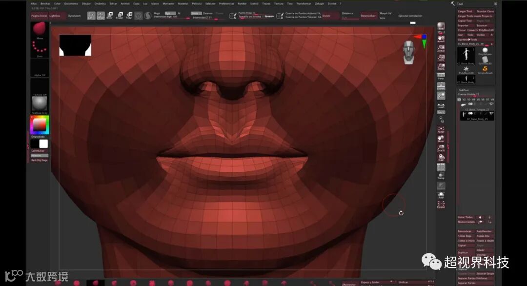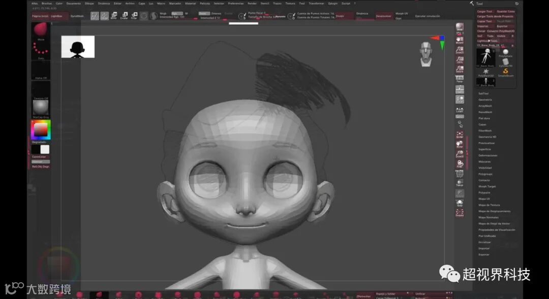 如果我们转到Morph部分,我们可以找到几个在这种情况下特别有用的变形。“头部比例”是我们角色卡通化的一大步,但“眼球比例”和“眼睛比例”也非常有用。经过几次调整后,我们可以把它带到Zbush来完成剩下的工作。正如我之前所说,我总是在没有透视的情况下使用 Zbrush,我喜欢可视化我正在使用的多边形,以便更准确地创建模型。修改完头部大小后,最重要的是定义颈部的高宽. 但在人物轮廓中忘记调整脖子的宽度是很常见的,导致人物轮廓与正面形象完全不同的奇怪感觉。