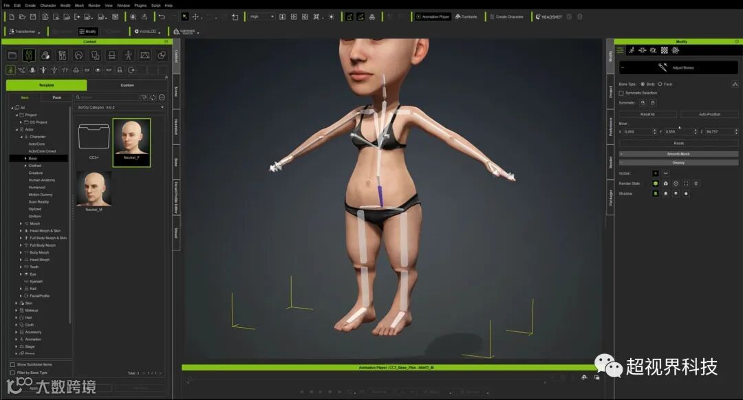 Character Creator 在这方面非常灵活,再加上它能够在将角色带入程序时自动纠正装备的所有问题:只需转到“调整骨骼”菜单并单击“自动位置”按钮即可。我们很快就会看到角色完全可以操作,尽管在这种情况下,眼睛应该重新定位。