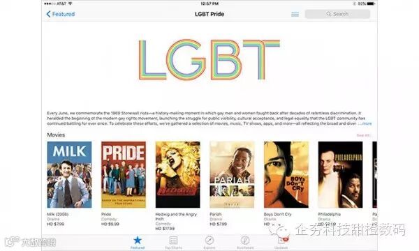 据科技博客AppleInsider报道,为了庆祝美国在LGBT(女同性恋者、男同性恋者、双性恋者与跨性别者)权力平等上取得的进步,苹果周四在iOS应用商店中增加了一个特别板块,指向的是能够反映LGBT骄傲的电影、音乐、电视节目、应用以及其它在线媒体。美国总统奥巴马将每年6月定为“LGBT骄傲月”。