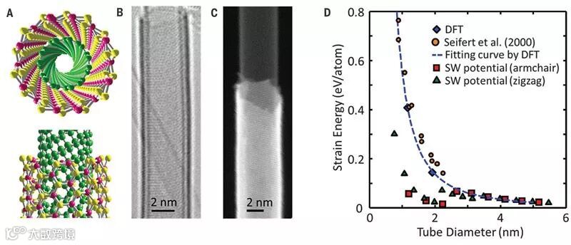 图5. SWCNT-MoS2纳米管一维范德华异质结构的表征。其中D为MoS2纳米管直径和应变能的关系。图片来源:Science