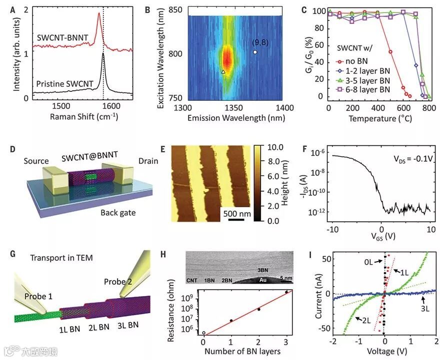 图7. SWCNT-BNNT一维范德华异质结构在光学(A和B)、热学(C)和电子学(D-I)方面的性质。图片来源:Science