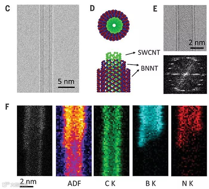 图3. 在SWCNT上生长出BNNT。其中D为像差校正HRTEM,F为EELS分析。图片来源:Science