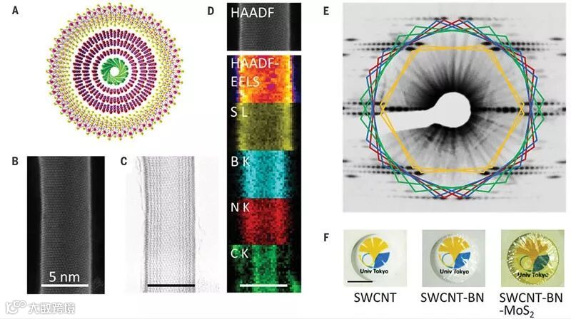 图6. SWCNT-BNNT-MoS2一维范德华异质结构 其中D为HAADF下的EELS分析,E为电子衍射结果。图片来源:Science