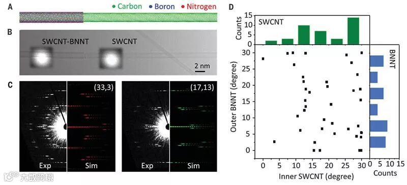 图4. 对SWCNT-BNNT范德华异质结构的结构表征。原子模型(A);TEM(B);实验和模拟的电子衍射图案(C)以及对纳米管手性的分析(D)。图片来源:Science