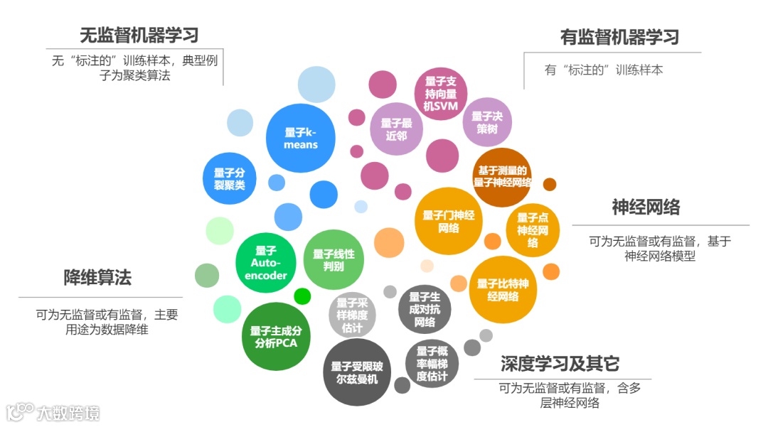 量子机器学习算法概览(注:以上分类不是互斥的,如量子自编码Autoencoder算法是基于神经网络的一种用于降维的算法,深度学习算法中无监督和有监督类型均有)