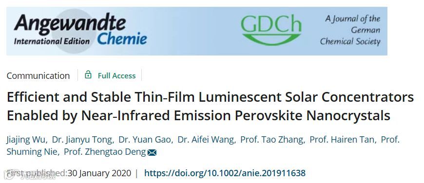 近日,南京大学现代工程与应用科学学院邓正涛教授团队采用一种新型的三苯基膦处理方法,制备了具有高光致发光量子效率、低重吸收、高稳定性的近红外发射铯铅碘量子点太阳能发电窗户原型器件。相关成果于2020年3月以“Efficient and Stable Thin‐Film Luminescent Solar Concentrators Enabled by Near‐Infrared Emission Perovskite Nanocrystals”为题在国际顶级化学期刊《Angewandte Chemie International Edition》《德国应用化学》杂志上在线发表(doi:10.1002/201911638)。