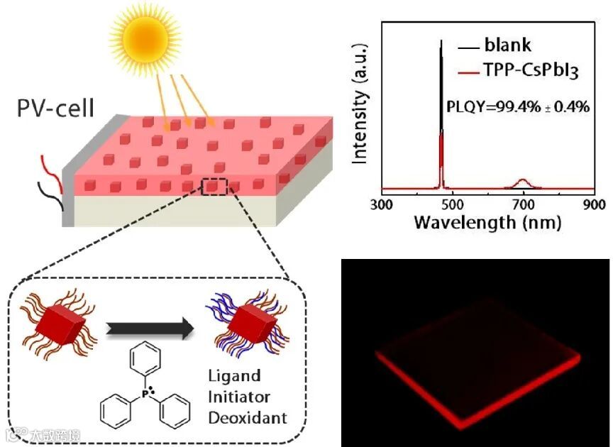 图1:近红外发电窗户原型器件。该工作采用一种新颖的三苯基膦处理方法,制备了高稳定性、大面积的铯铅碘量子点-聚合物复合薄膜发光太阳能聚光器,具有高的光转换效率和高的发光效率(绝对发光量子产率接近100 %)。