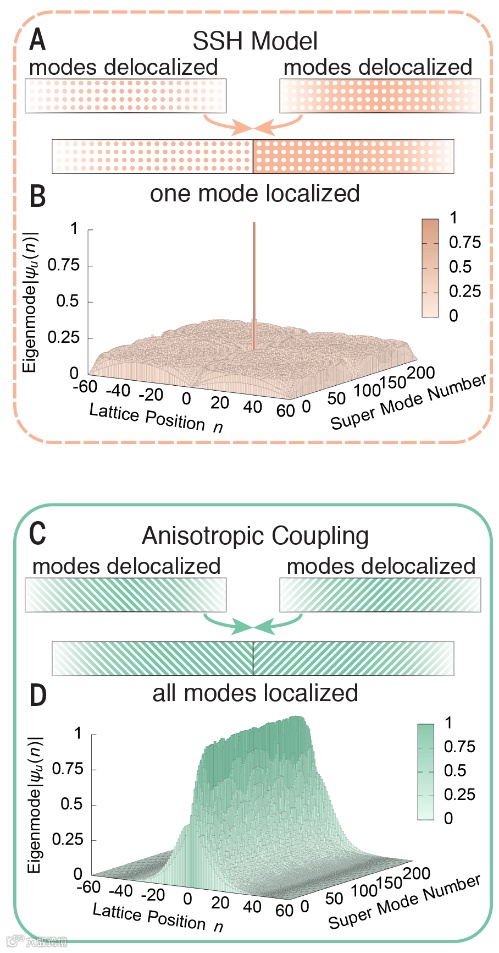 研究人员基于光纤环路结构,分别构建了厄米SSH模型和非厄米SSH模型。其中,厄米 SSH模型由具有交替耦合常数的一维链组成,如图1b所示。虽然最近邻耦合常数交替变化,但是系统仍然是各向同性的。非厄米趋肤效应模型(图1b)则具有交替变化并且具有各向异性的耦合常数,从一个格点到其相邻格点的跃迁不同于从其相邻格点跃迁回其自身。这种各向异性同样会导致非厄米性,尽管模型中既没有增益也没有损耗。由于平移不变性,当应用周期性边界条件时,两个晶格中的本征模都是非定域的。对于厄米SSH模型,当在SSH晶格某个位置引入界面时,只有一个模式在界面处局部化,即拓扑边界态。所有其他模式仍保持非定域(图2b)。而当在具有各向异性的非厄米晶格中引入界面时,情况大不相同。整个本征谱都产生塌陷,并且所有本征模在界面上都是局域化的(图2d),所有体模都转换成边界模。这种行为与厄米情况形成鲜明对比,传统体边对应关系被打破。在光学中,这意味着晶格接收的所有光信号都被引导到界面处并保持局域,就像一个非厄米光学漏斗,这一现象可能在某些应用场景具有独到的应用。