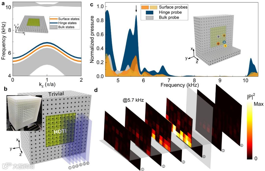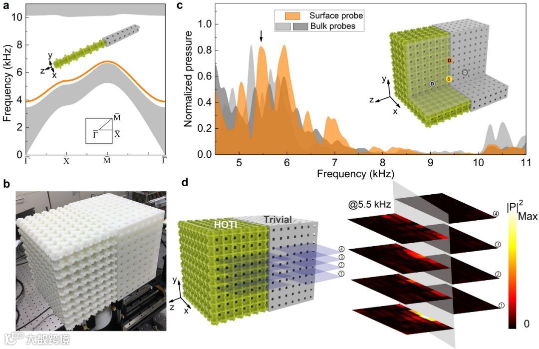 图2. 二维界面态的理论计算及实验表征。a.一维超晶格(由平庸晶格和拓扑非平庸晶格构成,只在一个方向打开边界)的投影能带。在体带隙中发现局域的拓扑界面态(由橘黄色线表示)。b. 3D打印样品,用以测量拓扑界面态。c. 样品透射谱的实验测量,其中界面态的响应曲线为橘黄色线/阴影,可以看出其响应高于体态(灰色的线/阴影),说明界面态可以被独立激发。d.界面态的声场实验扫描切面图。可以看到,激发的声场主要局域在x-y面上,远离这个面声场快速衰减。这些特征与界面态相符合。
