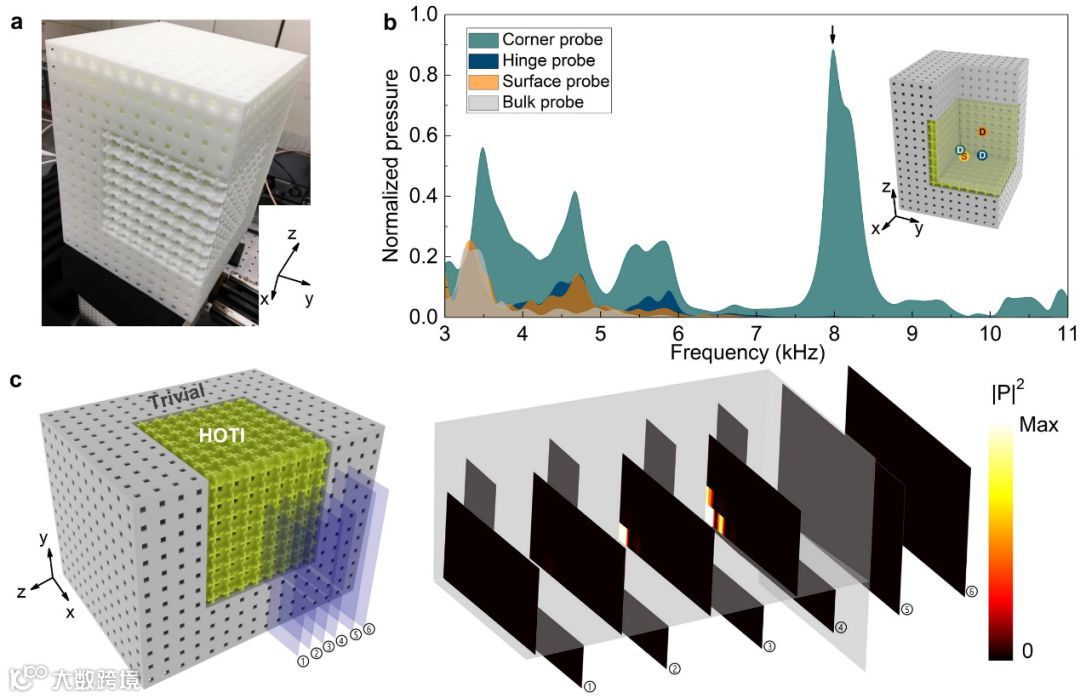 图4. 零维角态的实验表征。a. 3D打印样品,用以测量拓扑界面态、棱态以及角态。b. 实验测量的透射谱:其中界面态对应橘黄色线/阴影、棱态对应深蓝色线/阴影、角态对应深绿色线/阴影。可以看出角态的响应发生在体态、界面态以及棱态的带隙中。此外,界面态与棱态的响应在不同的频率范围有不同的响应强度,说明这些拓扑态可以用不同频率独立激发,体现了其多维层级的特征。c.角态的声场实验扫描切面图。可以看到,激发的声场主要局域在角上,远离角声场快速衰减。这些特征与角态相符合。