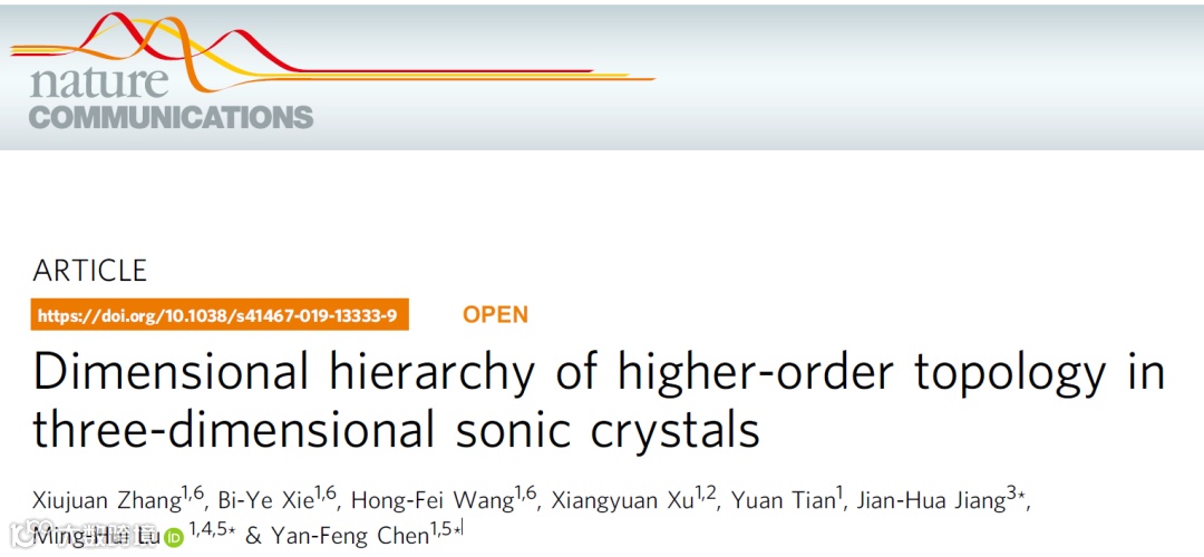 近日,南京大学固体微结构物理国家重点实验室、人工功能材料江苏省重点实验室、材料科学与工程系及人工微结构科学与技术协同创新中心的卢明辉、陈延峰的研究团队,与苏州大学蒋建华的研究团队合作,在拓扑物理和材料研究方面取得重要进展。他们发现二维拓扑界面态、一维拓扑棱态以及零维拓扑角态可以存在于同一个声学结构中,并基于精确设计和3D打印技术实现了这种支持多维层级拓扑态的三维高阶声拓扑绝缘体。文章以“Dimensional hierarchy of higher-order topology in three-dimensional sonic crystals”为题发表于近期的Nature Communications。