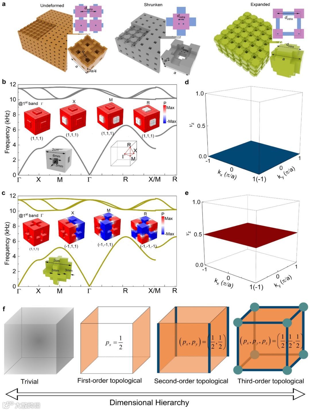 图1. 具有多维层级拓扑相的三维高阶拓扑绝缘体。a.文章设计的简立方声子晶体,从左到右分别为未变形晶格、收缩晶格以及扩张晶格。b-c.收缩晶格和扩张晶格的能带结构以及高对称点上的本征模式声场图。其中扩张晶格中本征模式在不同的高对称点上经历宇称反转,对应非平庸的拓扑性质。d-e. 收缩晶格和扩张晶格的体极化参数,后者对应非平庸的体极化参数。f. 当系统在不同方向上打开边界,高阶拓扑表现为多维层级拓扑态的出现。