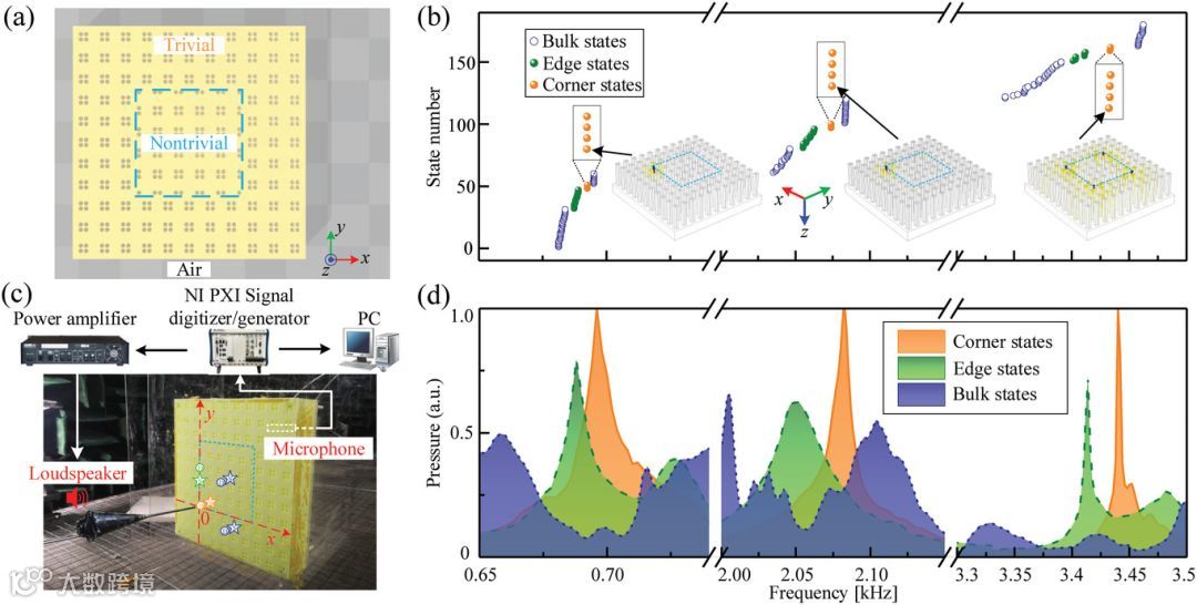 在此基础上,他们通过平凡区域(R/a=0.25)包围非平凡区域(R/a=0.75)构造了一个多孔同心正方晶体(CSC),如图2a所示。图2b描述了一阶(692.5Hz)、二阶(2074.1Hz)、三阶(3433.7Hz)本征频率附近角态对应的声学模式。由图2b可得到在本征频率附近的拓扑带隙中,存在拓扑边缘态和四个退化角态。图2c为多孔CSC样品与测试环境。图2d为对应体态、边缘态和角态的透射声谱。在拓扑带隙中,由一阶、二阶和三阶共振引起的拓扑角态的传输峰值分别在频率为696、2082和3440Hz处,这与图2b中的模拟结果相一致。