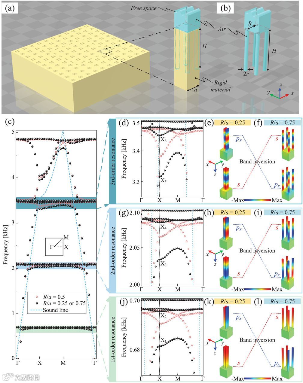 在本研究工作中,程营教授、刘晓峻教授课题组通过构造穿孔晶体来设计具有拓扑保护声角态的二阶拓扑绝缘体,实现了50倍亚波长尺度。实验观察到这些表面受限声态对制造缺陷具有显著的鲁棒性,并在三种不同的频率范围内证明了拓扑保护声角态。同时,研究者还验证了拓扑相位由2D-ZAK相位导出的跃迁可以通过缩小或扩大单元内一组孔距来调控。以此为基础,他们设计了一种亚波长拓扑成像的SOTI器件,实现衍射极限外的稳健声学成像。图1a为亚波长声学SOTI器件的结构示意图,该SOTI器件由周期性排列在正方晶格中的多孔材料组成。穿孔深度h=12cm,穿孔半径r=0.5cm;晶格常数a=4.8cm,孔间距为R,R/a=0.5。图1b描述了有限元仿真时声固耦合边界。图1c为标准、压缩、拉伸下多孔HOTI的色散曲线。图1j-l,g-i以及d-f分别描述了一阶、二阶、三阶共振频率周围的能带特性。从图1可得,在高对称点处,材料结构存在能带反转现象。当系统引入微小扰动时(晶格压缩或者拉伸),高对称点处的能带简并打开产生带隙,如图中黑点所示。同时,他们还证明能带反转是一种拓扑相变,它可以用2D-ZAK相来表征。