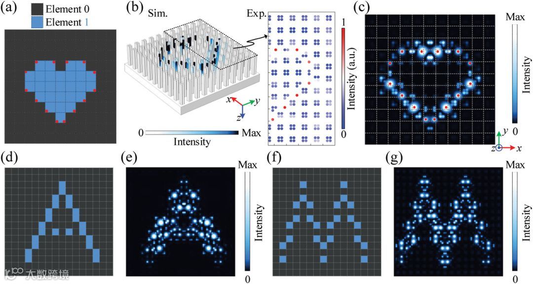 根据上述研究分析,研究人员提出了基于多孔SOTI和二阶拓扑绝缘体角态的声学成像设备。如图5所示,可编程的多孔SOTI由两种波长数字元素“ 0”和“ 1”组成,它们分别对应拓扑角电荷Qcorner = 0(R / a = 0.25)和Qcorner = 1(R / a = 0.75)的非平凡拓扑态。图5a展示了一个11×11阵列的多孔SOTI器件,可以形成心形声学轮廓成像。频率f = 692.5 Hz的激发源放置在可编程多孔SOTI器件的表面,以激发一阶谐振的拓扑角态。图5b为其对应声强场的模拟分布。测得的声像是图5b右面板所示样本的一半。测试结果表明,大多数的能量都局限在拐角处,其位置与图5a中红色虚线标记的位置一致,从而验证了深亚波长多孔SOTI声学成像设备的有效性。图5c中心形保持其亚波长特征可见,且大多数能量高度限制在图5a中红点标记的拐角处。此外,通过编码多孔阵列元素来调整形状,能够实现各种拓扑结构的深亚波长成像。图5d,e和f,g分别为字母“A”和“M”的编码阵列和对应的深亚波长成像。