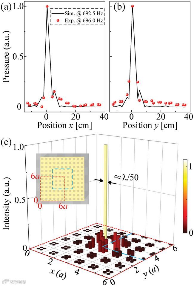 为了证明拓扑态对拐角处能量的限制,他们沿x和y方向测量了每个孔中的归一化压力幅值分布。从图3a和b可以看出,模拟结果与测量结果沿所述方向相一致,且原点处的声密度最大。此外,为了显示超出衍射极限角态的范围,他们对正方形区域(图3c中的红色虚线框)进行了扫场,测量该区域内每个孔底的归一化声强。图3c为696Hz频率下角态的声场强度分布。测量结果显示多孔CSC能够将声波能量限制在直径为d≈λ/50的狭窄区域内。