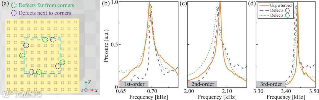 拓扑绝缘体拓扑态的特性之一是对制造缺陷的鲁棒性。因此,程营教授、刘晓峻教授等通过调整拐角处孔的分布(随机地消除或增加孔的数量)引入系统缺陷,并验证深亚波长拓扑成像SOTI器件对制造缺陷的抵抗能力。图4b–d分别为一阶、二阶、三阶本征频率周围拓扑角态的透射声谱。通过对比声压场幅值分布,可以得到当系统存在制造缺陷时,拓扑角态仍可保持在三个拓扑带隙内,且最大幅值频率偏移可以忽略,该实验结果证明了多孔SOTI器件角态对制造缺陷具有较好的鲁棒性。