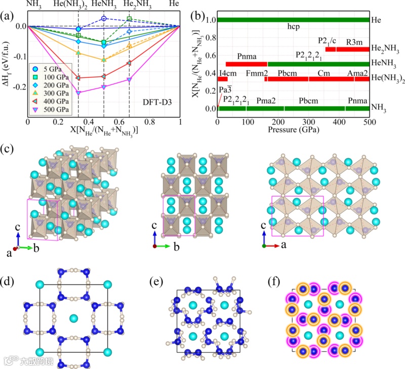 图1:氦-氨化合物的能量稳定性和晶体结构