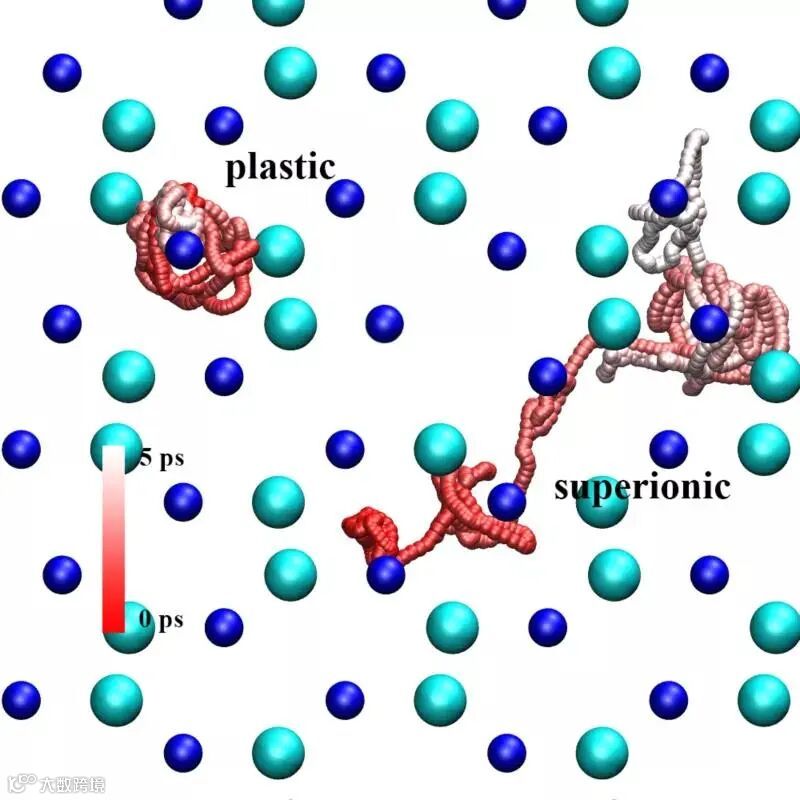 图2:在HeNH3O晶体中氮原子(蓝色),氦原子(青色)和氢原子(红色到白色渐变)的运动行为。为了方便展示,超离子态(superionic)和塑晶态(plastic)中氢原子的轨迹同时置于氮氦原子固态网格中。时间刻度由红色(初始)到白色(结束)标记。