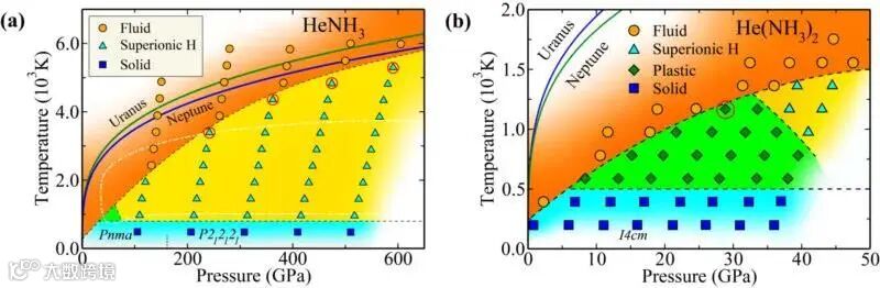图3:理论预言的氦氨化合物的温度压强相图。不同的标志代表不同的物态,蓝色正方形表示固体,深绿色棱形表示塑晶态,青色三角形表示超离子态,黄色圆形表示液态。白色虚线表示纯氨中的超离子态区域,绿色和蓝色实线分别表示天王星和海王星的等焓线。