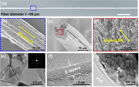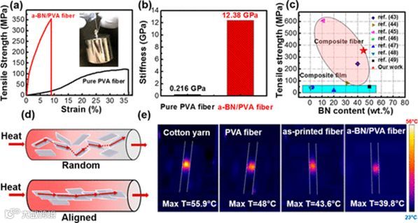 致密的结构和良好排列的BNNS极大地改善了a-BN / PVA复合纤维的机械性能。纯PVA纤维和a-BN/PVA复合纤维的应力应变曲线如图4a所示。45 wt% BNNS的复合纤维的抗拉强度为355 MPa,是纯PVA纤维(122 MPa)抗拉强度的近3倍。a-BN/PVA复合纤维的刚性也显著提高至12.38 GPa,约为纯PVA纤维的57倍(图4b)。机械强度的提高归因于高度对齐的BNNS的结构以及PVA和BNNS之间的良好界面相容性。复合纤维的高机械拉伸强度超过了大多数现有的基于BN的纤维,体现了优异机械性能(图4c)。
