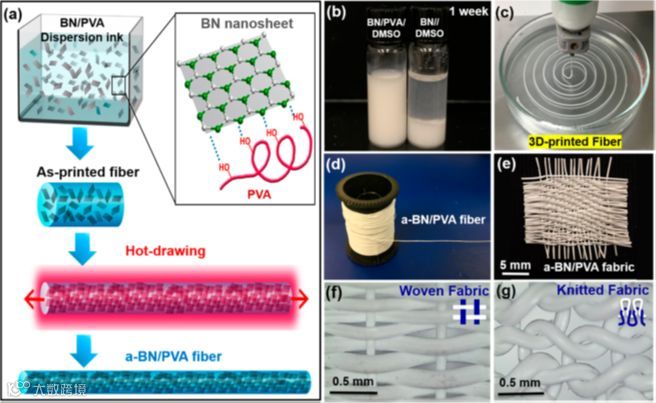具有二维结构的氮化硼纳米片(BNNS)具有高达2000 W/(m·K)的高面内导热率和良好的电绝缘性,被认为是热管理应用中的有效材料。为了利用BNNS的面内导热性能,必须使其取向良好并均匀分散。由于在聚乙烯醇溶液中,利用超声作用可以使BNNSs保持空间稳定,由此实现均匀分散。通过纤维印刷过程中的单轴拉伸流动和进一步热拉伸加工,使纳米复合纤维中的BNNSs具有良好取向,可以形成能量传导通道。因此,基于a-BN/PVA复合纤维的可穿戴纺织品可以有效地将人体产生的热量从皮肤转移到凉爽的周围环境,带来优异的降温效果。