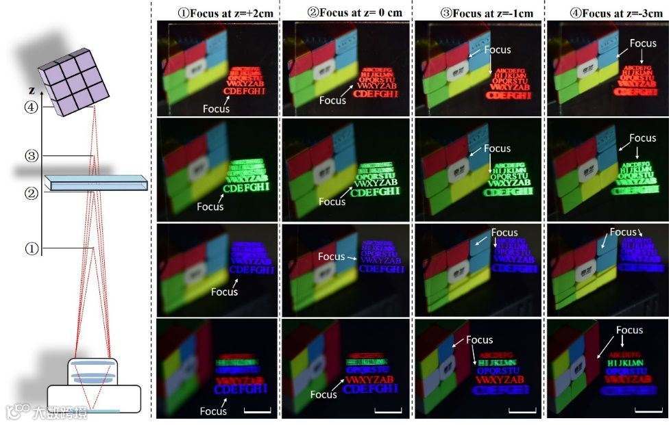 为了提高3D显示体验效果,研究团队设计并制备了紧密连续取样视点的metagrating像素结构,再现连续3D光场的波前信息,重现了单色和彩色的3D光场信息。利用相机模拟单个眼睛调焦过程时发现,投影在不同深度的彩色字母与真实物体的深度信息一致,攻克了以往3D显示中的辐辏调节矛盾这一国际难题。