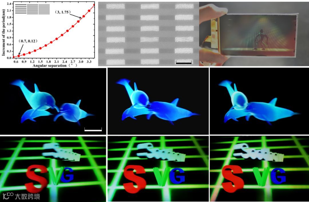 团队理论计算了会聚视点再现角间隔与像素化metagrating周期和取向变化的关系。像素内结构变化精度达到亚纳米级才能形成会聚视点。例如,为获得0.7°的视角间隔,metagrating周期调控精度需达到0.12nm。为了攻克亚纳米精度metagrating的制备难题,研究团队自主研制了紫外连续变频纳米光刻系统,可实现亚纳米调控精度的像素化metagrating制备。