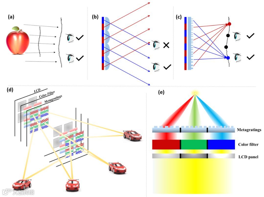 综上,研究团队提出的基于像素化metagrating的全息采用3D显示技术与平板显示结合,实现了具有运动视差的宽视角彩色动态3D显示,并解决了3D显示中辐辏调节矛盾引起的视觉疲劳。此外,该器件结构轻薄,易于批量复制,为今后在移动显示设备上实现高品质3D效果提供了全新解决方案。