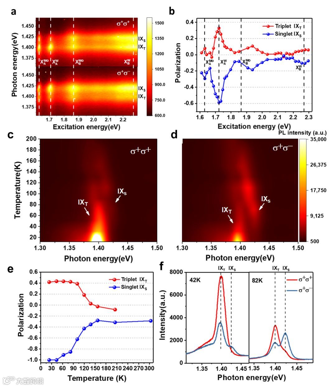 最后,研究人员通过光致发光激发光谱(PLE)发现单线态和三线态层间激子表现出相反的谷极化特性,单线态层间激子的谷极化率更大,并且通过光致发光激发光谱(PLE)发现单线态和三线态层间激子在共振激发时展现出更强的谷极化特性(图3a,b)。此外,从谷极化特性随温度变化特性可以看出(图3c-f),单线态和三线态层间激子的谷极化特性随温度升高而减弱,单线态层间激子在20 K时几乎达到100%。