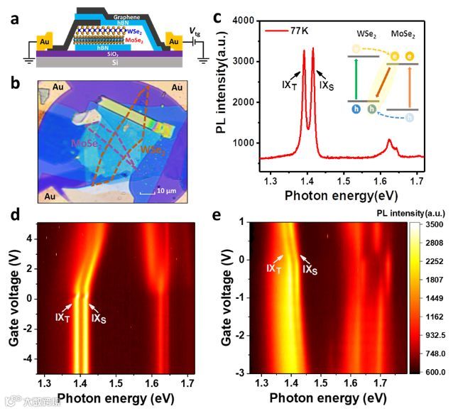 首先,研究者发现在BN/WSe2/ MoSe2/BN三明治结构器件中(图1),WSe2和MoSe2层内激子由于在type-II能带结构中强烈的电子转移而被极大地抑制。同时在~1.4 eV出现两个明显的PL峰,分别是单线态和三线态层间激子。通过PL随静电掺杂的变化发现,单线态和三线态层间激子展现出明显的蓝移,并且当堆叠顺序相反时则出现明显红移。
