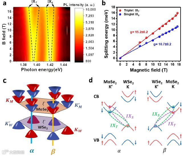 其次,通过考察PL随磁场变化趋势可以发现(图2),由于塞曼效应,线偏光激发下的单线态和三线态层间激子展现出极强的能谷塞曼分裂,它们的g值分别为10.7和15.2,与理论预期相符。