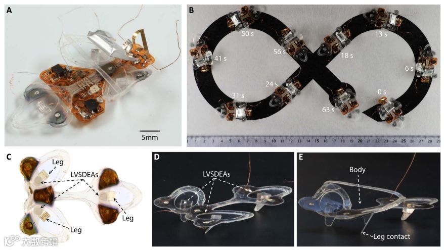 昆虫一直是机器人专家的灵感来源。它们柔软的身体让它们能够挤过小开口,对冲击有很强的弹性抵抗能力,这赋予它们顽强的生命力,我们可能会不由自主的想到那只“打不死的小强”。然而,让该软体机器人不受束缚,同时能够智能地对环境做出反应,是一个长期存在的挑战。其中软致动器的低功率密度是一个障碍,导致小型机器人无法携带传感器和控制电子设备及电源。介电弹性体致动器(DEAs)是一类静电电活性聚合物,可承受千赫兹的高功率密度操作,但通常需要几千伏电压才能达到完全应变,同时千伏电源的质量限制了DEA机器人的速度和性能。