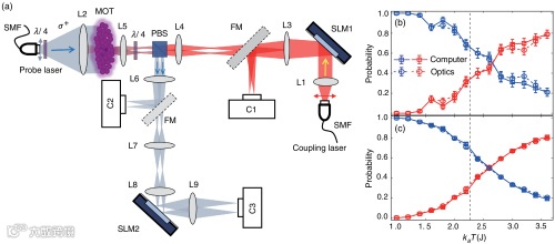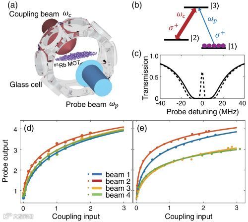 基于EIT的非线性光学激活函数由激光冷却的85Rb在两维磁光量子阱(MOT)中实现。原子位于基态,圆偏振耦合激光束横向入射到原子云中,并与中间态到激发态之间的跃迁相耦合,而反向输入的探测激光束对应基态到激发态之间的跃迁。在没有耦合光束的情况下,原子介质对探测光束是不透明的,其最大程度的被原子吸收。相反,当存在耦合光束的情况下,中间态之间的量子干涉导致EIT光谱窗口,并且其带宽由耦合激光强度控制。探测光束的强度由耦合光束的强度非线性控制,因而可以通过将耦合强度作为输出并将发射的探测强度作为输入,来实现非线性激活函数。通过将反向传播耦合探测光束放置在MOT的不同位置,就能够为不同的神经元实现不同的非线性激活函数。显然,来自不同非线性激活函数的误差也是独立的,结合SLM和透镜实现的线性操作的优点,AONN方案有望扩展到大尺寸,并且误差控制在较小的范围之内。