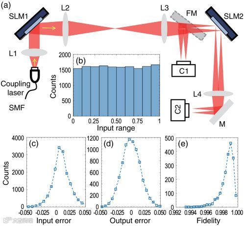 在线性运算过程中,SLM中不同区域的入射光功率代表不同的输入层节点。通过叠加多个相位光栅,入射光会照射到不同的方向并且具有一定的权重。SLM位于透镜的后焦面并进行傅立叶变换,将所有衍射光束在同一方向上叠加到其前焦平面的点上,从而实现线性求和功能。通过一定的迭代反馈算法能够获得线性矩阵元素,在少于10次迭代中就可以实现超过95%的高精度。这种方法的优点在于只要SLM的分辨率足够高,取样点的误差就不依赖于取样点的总数,这与以前的研究相比有本质的区别。