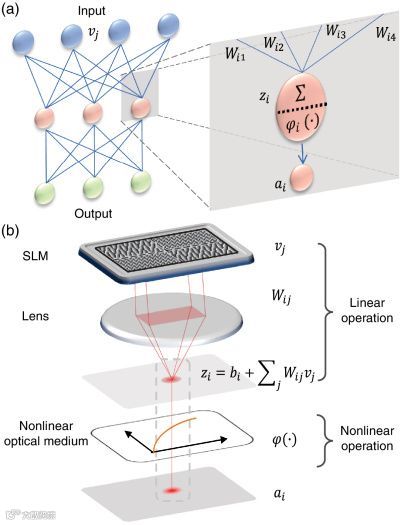 与计算机芯片中的电子载体不同,光子作为非相互作用的玻色子,可以自然地用于实现光速的多重互连和同时并行计算。人工神经网络的关键成分是人工神经元,它对输入信号执行线性和非线性变换。在大多数混合光学神经网络(ONN)中,光学主要用于线性操作,而非线性函数通常以电子方式实现。最近,基于纳米光子电路和光波线性衍射和干涉的ONN已被证明可用于高效的机器学习,但深层网络中仍然缺乏非线性光学激活函数。尽管已经提出了实现非线性光学激活函数的建议,但实验实现较困难,这已经成为在实际应用中进一步扩展ONN的瓶颈。