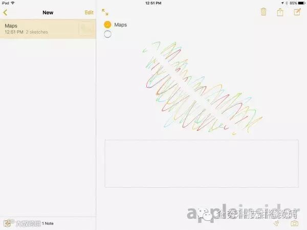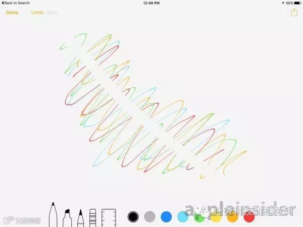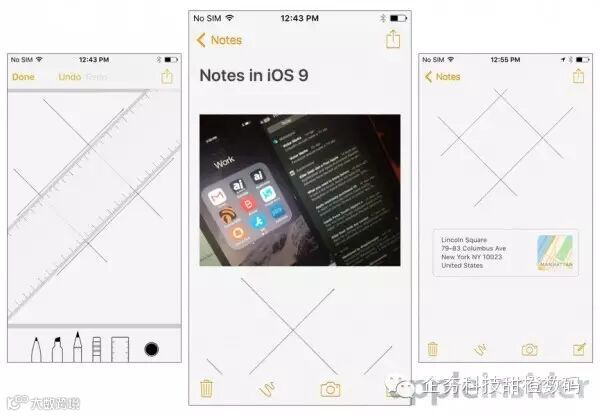 iOS 9首个beta版本本周已经向开发者开放,在最新的“备忘录”应用中用户可点击底部导航栏的“素描”按钮来绘制新的备忘录,在该类目中用户可通过一系列涂鸦工具(铅笔、水笔和记号笔、橡皮擦和直尺)来随心绘制你想要的图片。在iPad和iPhone的横屏模式下,备忘录会直接提供黑色、灰色、深蓝色、浅蓝色、绿色、黄色、橙色和红色八种颜色选项。