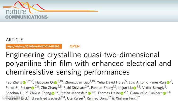 近期,德累斯顿工业大学Xinliang Feng课题组报道了一种基于自组装単分子层的气-液界面聚合方法,成功构筑了大面积二维导电聚合物晶体薄膜。该方法将传统气-液界面的限域作用与自组装单分子层的诱导组装能力结合,克服了传统苯胺聚合反应中容易自聚集的问题,成功合成出晶圆级尺寸(约为50 cm2),并且厚度可在2.6-30 纳米内任意调节的二维聚苯胺薄膜。所得的聚苯胺薄膜表现出连续的单晶衍射图案,平均晶粒尺寸约为1.5μm。高分辨透射电子显微镜(AC-HRTEM)表征表明,在每个晶粒内,所有聚苯胺分子链均沿着薄膜横向排列成完美的expanded-coil构象,这也是首次对聚苯胺分子链的分子级成像,对导电聚苯胺链间传输机理研究具有重要意义。由于其优异的晶体结构以及二维形貌,所获得的二维聚苯胺表现出各向异性的电荷传输,被盐酸掺杂后其横向电导率高达160 S cm-1。相比之下,通过其他方法构筑的聚苯胺薄膜,由于晶体缺陷及分子链的无规构象,在厚度低于20纳米时,均难以测出导电性。通过该二维聚苯胺薄膜制备的化学传感器,能够有效监测低至30 ppb的氨气和10 ppm的挥发性有机化合物(VOCs)。由于聚苯胺本身具有非常广阔的应用前景,该二维聚苯胺薄膜有望在透明电极、柔性电子和选择性分离膜等许多领域得到应用。这一成果在最新一期的《自然·通讯》上发表(Nature Communications 10,4225, 2019)。