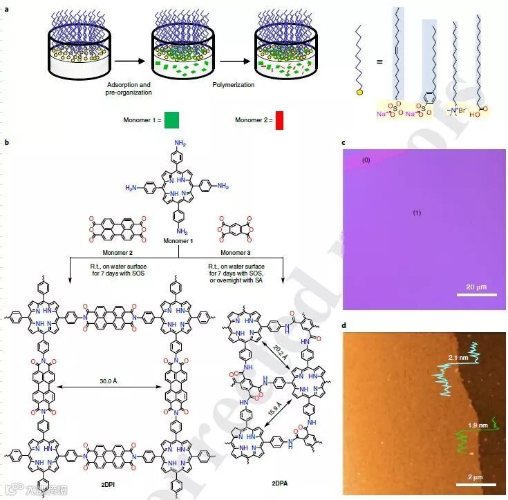 图4.自组装単分子层辅助气液界面聚合构筑二维聚酰亚胺(2DPI)和聚酰胺(2DPA)单晶