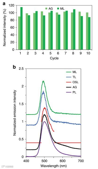 a:在10个周期的紫外激发(1分钟)、等待(3分钟)和在荧光粉聚合物复合样品表面上拖动杆的过程中,余辉(AG)和力致发光(ML)强度的变化。AG和ML都归一化到各自的平均值。