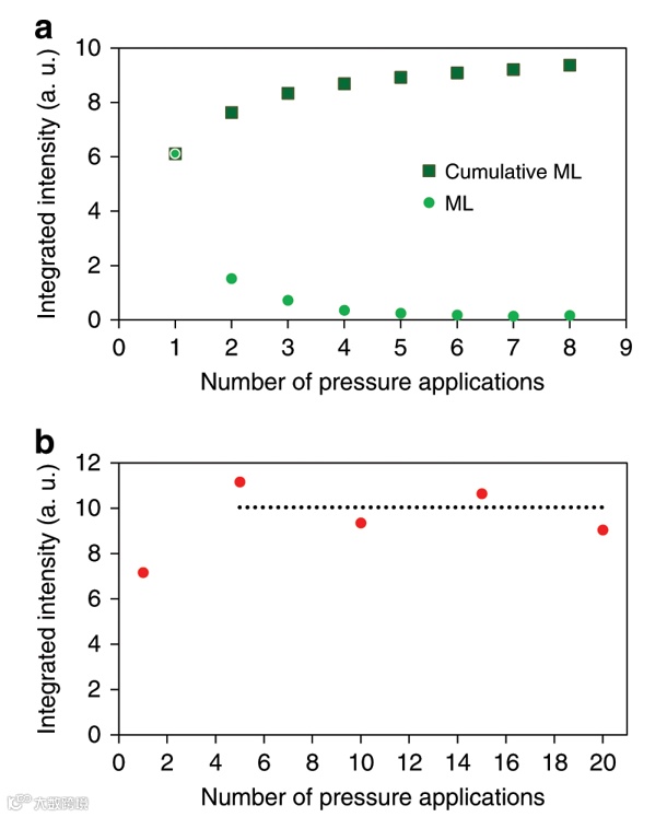 a:力致发光和压力记忆强度与所施加载荷大小的关系。