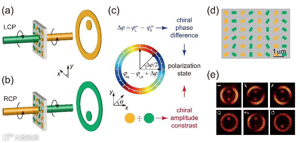 图1. (a,b) 圆偏振相关全息超表面在左旋和右旋圆偏振光照射下的全息图示意;(c) 圆环相位差分布及偏振测量原理示意;(d) 加工的超表面SEM假色照片,与a和b相同,不同颜色代表针对不同圆偏振光起作用的结构;(e) 部分测量得到的通过水平偏振片的全息图像。