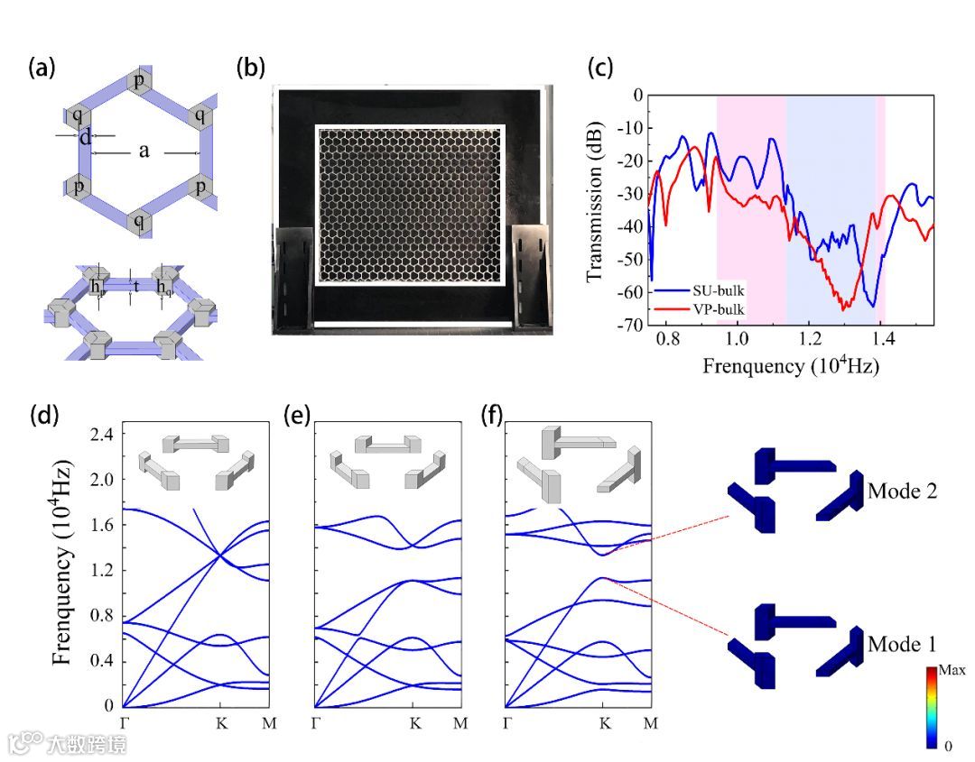 在该工作中,研究人员通过构建同时具有反演对称性和z=0平面镜面对称性的梁柱式六角晶格,在倒空间K及K’点处实现了四重简并的二重狄拉克锥。在简并点处的两个本征态分别是两个对称(S)模式和两个反对称(A)模式,以此可以有效地模拟凝聚态物理中电子的真实自旋 。当晶格关于z=0平面的镜面对称性被破缺时(SU和SD晶格),由于自旋轨道耦合,量子自旋霍尔效应型带隙在每个波谷周围被打开,同时A模式和S模式通过线性组合成为赝自旋向上和赝自旋向下。而当晶格的反演对称性被破缺时(VP和VQ晶格),量子谷霍尔效应型带隙在波谷周围被打开,此时,波印廷矢量不同的旋转方向定义了不同的谷态。通过调节参数使两种带隙的中心频率尽可能重叠,当两种不同拓扑类型的晶格拼接在一起时,会界面处产生具有鲁棒性的边界态。