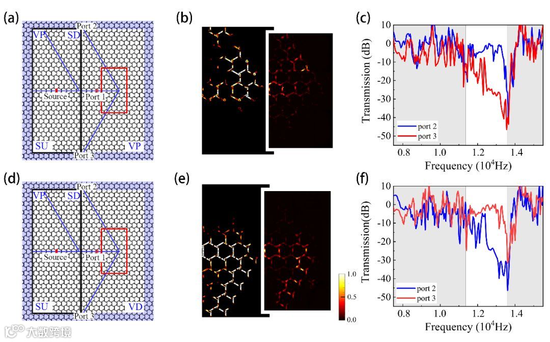另一方面,谷自由度(谷K和K’)可用于模拟通信中的信号位(逻辑0和1),因此基于非平庸拓扑的分束器对于实际应用是有用的。研究人员设计了一个箭头形分束器,它由四个域组成:两个是QVH型(VP和VQ),另一个是QSH型(SU和SD)。通过对拓扑滤波器的选择,可以控制弹性波中蕴含的谷信息,从而控制端口的通断。